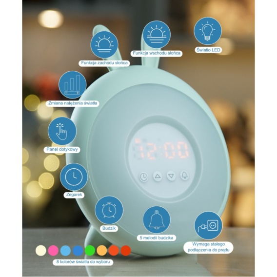 Jest to również podręczna lampka nocna, która świeci światłem w różnych kolorach. Jasność można regulować w zależności od potrzeb i otoczenia. Lampka posiada funkcję drzemki, dla tych bardziej opornych - wystarczy wcisnąć przycisk powtarzania budzenia i skorzystać z dodatkowego czasu na sen. Budzi dźwiękiem 5 melodii, w tym dwóch odgłosów natury. Wyposażona jest w antypoślizgowe nóżki, sterowanie dotykowe, cyfrowy wyświetlacz z ustawieniami 12h/24h.