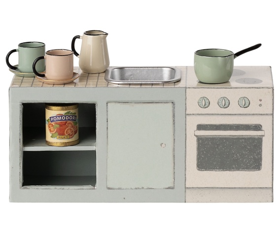 Mały blat kuchenny jest wyposażony: w 2 kubki i 2 talerze, garnek i dzbanek oraz małą puszkę. Mały zlew jest wykonany z metalu, aby wyglądał jak najbardziej realistycznie. Idealnie pasuje do kuchni w domku dla myszy SuitCasa.