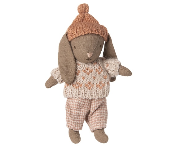 Króliczek Micro w kolorze brązowo-różowym. Ubrany na chłodne dni w uroczy dzianinowy sweter, różowe spodnie i pasującą wełnianą czapkę. Ten przytulny króliczek jest pełen serdecznego uroku. Jego miękkie, przytulne ciałko ma idealny rozmiar dla małych rączek i kieszeni, dzięki czemu idealnie nadaje się do zabrania ze sobą w podróż. Króliczek pasuje do akcesoriów Maileg w rozmiarze micro i został zaprojektowany do zamieszkania w domku House of Miniature dla Lalek, razem z resztą rodziny Króliczków.