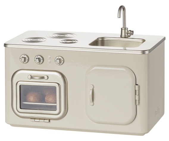 Nasza piękna miniaturowa kuchnia to pozycja obowiązkowa w każdym domu. Idealnie pasuje do miniaturowego domku dla lalek Maileg House. Kuchnia jest wyposażona w 3 świeżo upieczone bułeczki w piekarniku i jest wykonana z metalu, aby zapewnić długą żywotność i godziny zabawy.